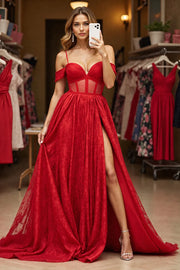 Red Corset A Line Cold Shoulder Long Lace Prom Dress