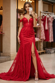 Red Lace Corset Mermaid Cold Shoulder Long Prom Dress with Slit