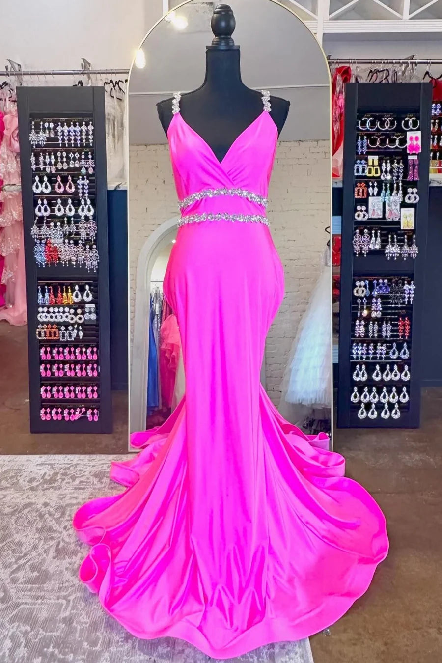 Red Surplice Open Back Beaded Mermaid Long Formal Dress