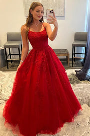 Red Tulle Long Prom Dress with Lace A-Line Backless Evening Graduation Dress