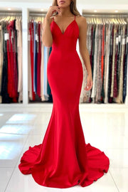 Red V-Neck Long Prom Dress Mermaid Backless Evening Party Dress
