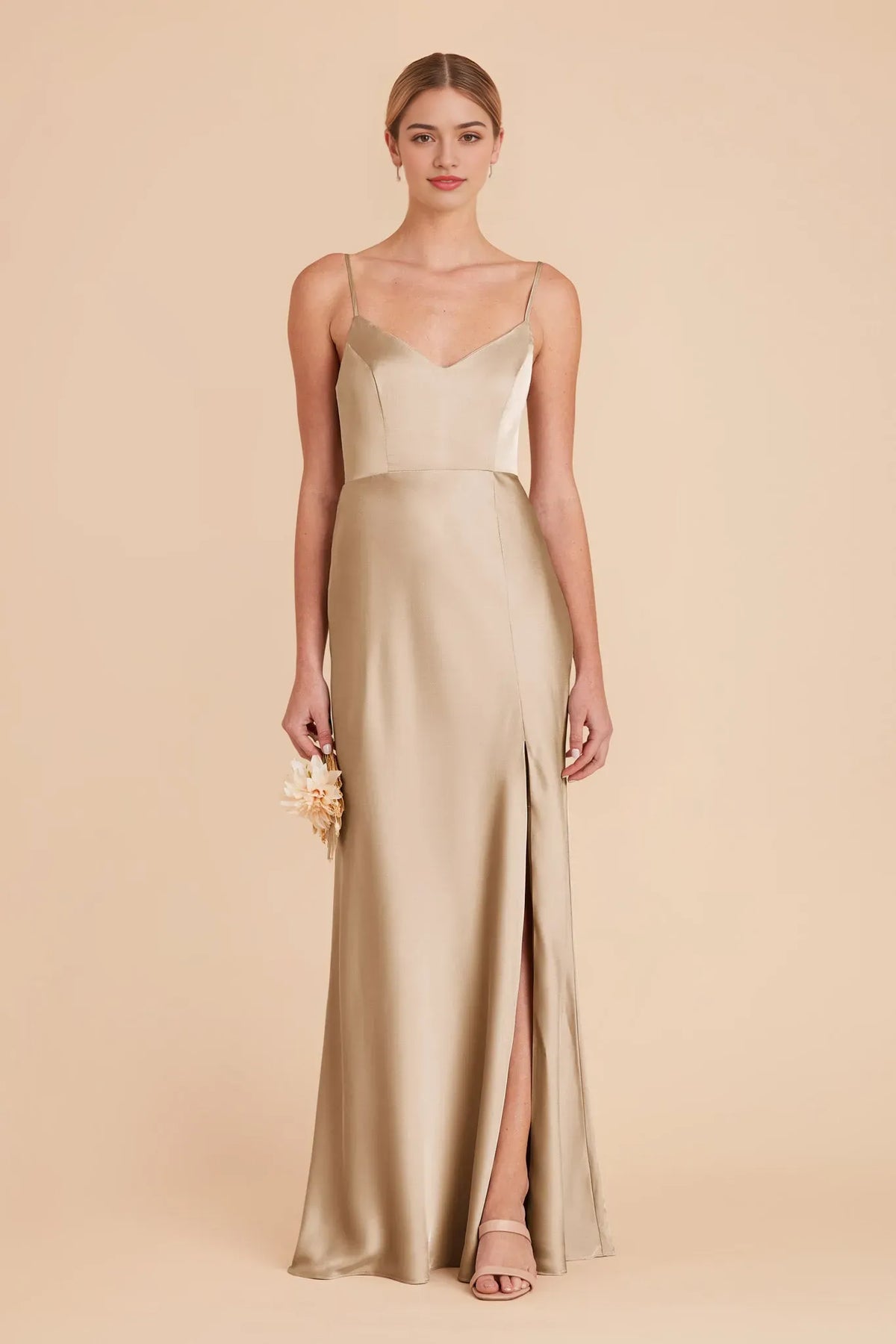 Champagne Satin V - Neck Prom Dress Spaghetti Strap Gown with Side Slit for Effortless Elegance - US 2 / UK 8 / EU 32