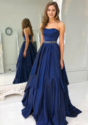 Romantic Navy Blue Strapless Prom Dresses with Rhinestone Belt Flowy Tiered Skirt Satin Fabric Ideal for Fairytale Proms