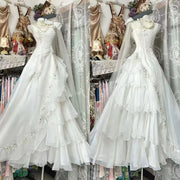 Luodilan's romantic white maxi prom dress features a delicate sweetheart neckline with detachable short puff sleeves, paired with a dramatic ball gown silhouette that exudes fairy-tale elegance. The structured bodice features intricate ruched detailing and delicate floral lace appliqués, transitioning into a full skirt composed of layered, flowing organza ruffles. The back showcases a smocked panel for a flexible, comfortable fit, while cascading lace trim runs down the side of the skirt, adding a touch of vintage-inspired luxury. Crafted from lightweight organza and soft tulle, the dress balances volume and grace, ensuring both comfort and visual impact.