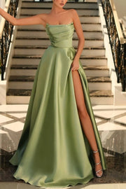 Satin A-Line Scoop Empire-Waist Pleated Satin High Slit Formal Prom Dress