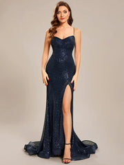 Sequin Lace-up Back High Slit Mermaid Prom Dress