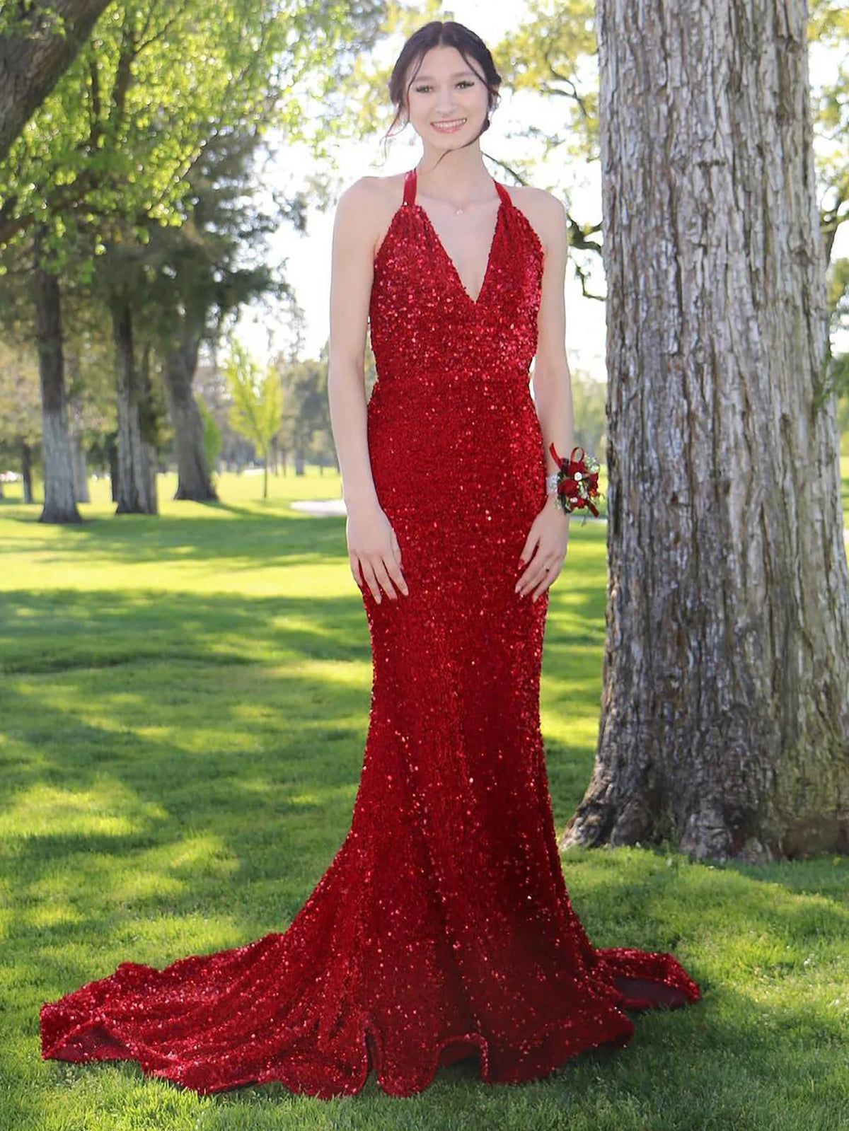 Sequin Red Mermaid Halter Open Back Prom Dress
