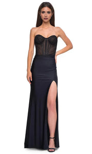 Sexy Strapless Mesh Corset Top Black Prom Dress with High Side Slit for Formal Evening Events