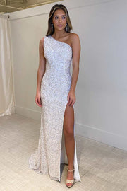 Silver Sequin One-Shoulder Lace-Up Back Long Formal Dress with Slit