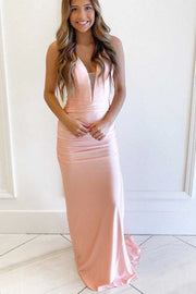 Simple Deep V-Neck Pink Mermaid Long Formal Prom Dress