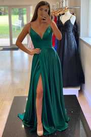 Simple Satin Long A-Line Prom Dress V-Neck Spaghetti Strap Evening Dress with Slit