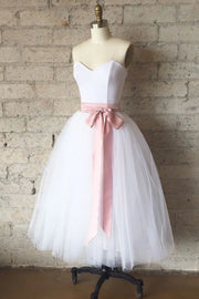Simple white tulle tea Length prom dress white bridesmaid dress