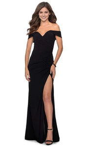 Sleek Black Jersey Knit Off - Shoulder Prom Dress with Side Slit for Effortless Glamour