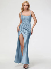 Satin Dusty Blue Prom Dresses Square Neckline Spaghetti Straps Sleeveless Trumpet/Mermaid Stretch Prom Dresses