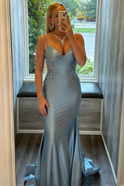 Spaghetti Straps Mermaid Appliques V-Neck Pleated Prom Dress