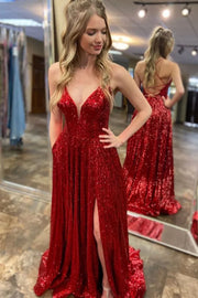 Spaghetti Straps V-Neck Glitter Sleeveless Pleated Prom Dress with Slit