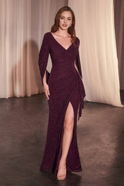 Sparkle Plum Prom Gown with V - Neck Draped Front Flared Sleeves and High Slit A Statement Piece for Luxury Ball Events - US 2 / UK 8 / EU 32