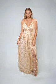 A-Line Deep V-Neck Tie-Shoulder prom dress. Occasions: Prom, black tie events, formal weddings, and upscale parties.