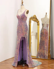 Sparkly Light Purple Lace-Up Back Sequins Long Prom Dress with Fringes