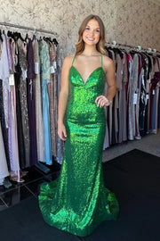 Sparkly Mermaid V Neck Green Sequins Long Prom Dresses