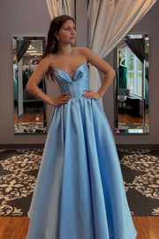 Strapless A-Line V-Neck Sleeveless Empire-Waist Pleated Satin Long Prom Formal Dress
