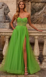 Elevate your presence at international ballroom affairs and foreign - trade galas with this show - stopping green prom dress. The strapless design showcases a beaded corset bodice, adorned with intricate beadwork that adds a touch of luxury and sparkle. Crafted from flowing green tulle, the skirt features a dramatic high side slit for graceful movement and a hint of allure. With a built - in pocket for convenience and a flattering silhouette, this gown blends elegance, glamour, and practicality, ensuring you stand out as the center of attention at any upscale formal occasion.