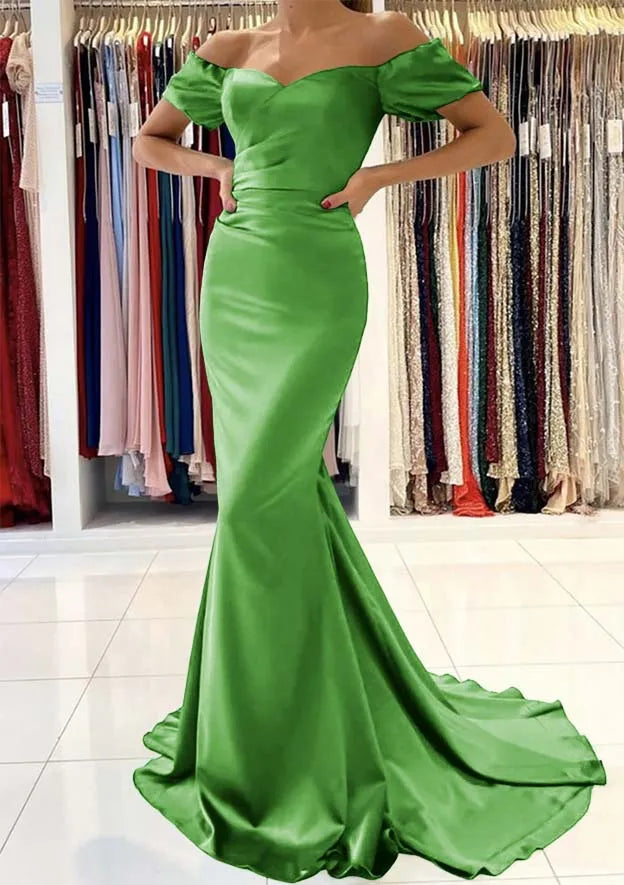 Trumpet/Mermaid Off-the-Shoulder Short Sleeve Satin Sweep Train Prom Dress With Pleated - US 2 / UK 8 / EU 32