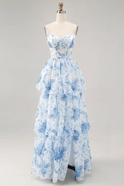 White and Blue Floral Corset Ruffled Long Wedding prom dresses with Slit