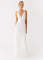 White Satin Prom Dress with Plunging V - Neckline and Fitted Silhouette for Formal Occasions - US 2 / UK 8 / EU 32