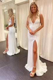 White Sequined V-Neck Mermaid Prom Dress with Slit